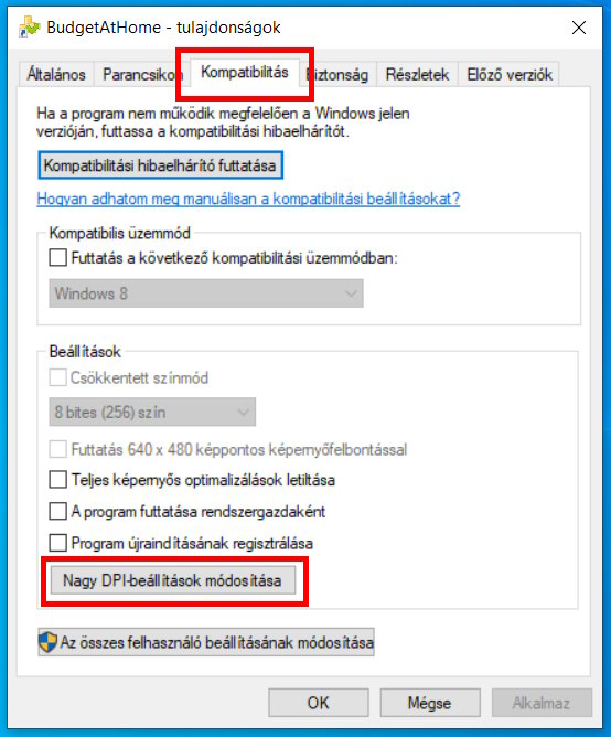 - Ott lesz az ablak alján egy "Nagy DPI beállítások módosítása" feliratú gomb, arra rá kell kattintani.