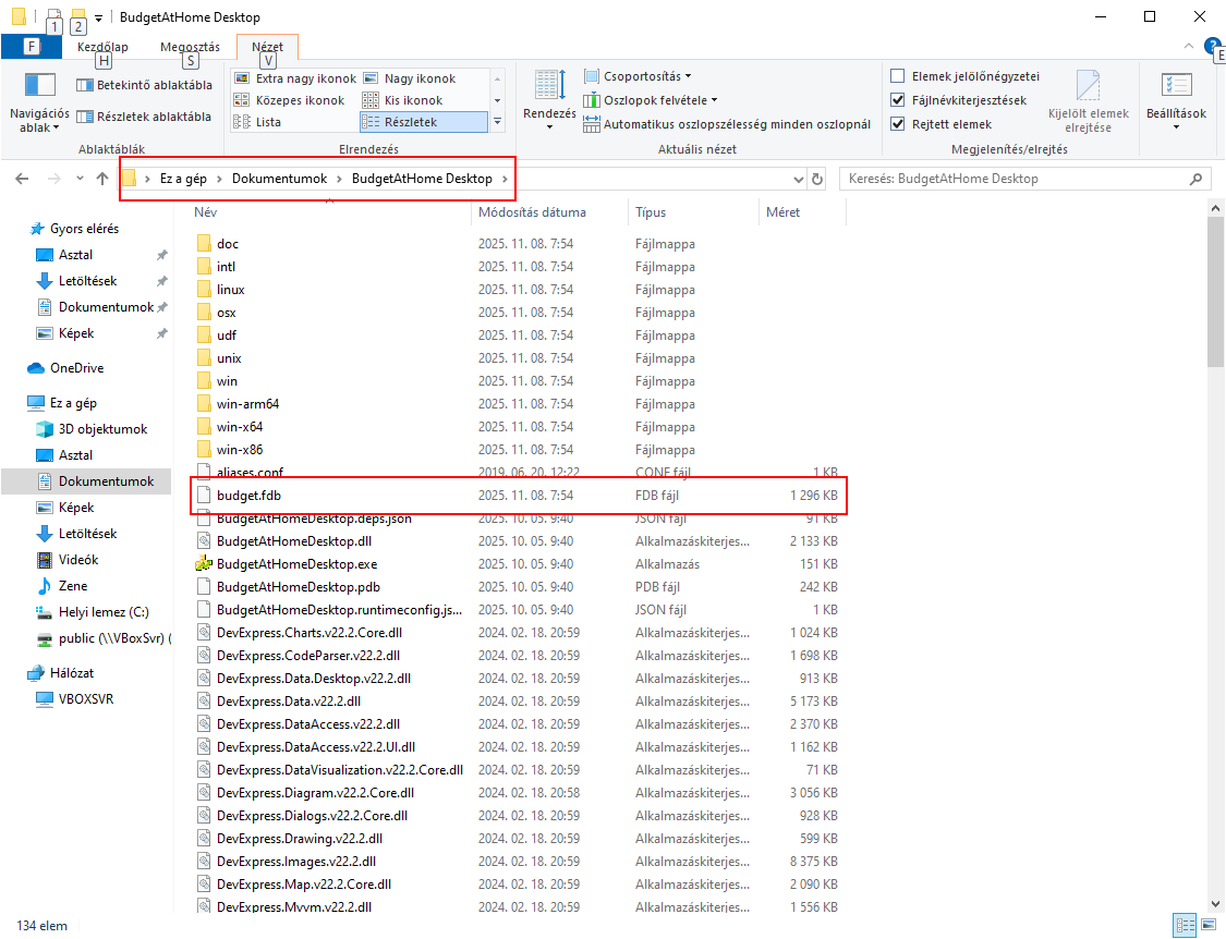 Kifejezetten szeretnék kérni mindenkit, aki ezt a szoftvert használja, időnként készítsen biztonsági másolatot az adatbázisról. Ez a program telepítési mappájában a budget.fdb fájl. Lent látható egy képernyőkép segítségül, kattintásra nagyítható. Ezt a fájlt rendszeres időközönként mentsük el máshova, a saját felhő tárhelyünkre, vagy bárhova ahol biztonságban érezzük. A biztonsági másolat készítése előtt ha lehet, lépjünk ki a szoftverből, zárjuk be az ablakát.